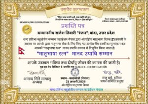 मातृभाषा रत्न अंतर्राष्ट्रीय मानद उपाधि सम्मान